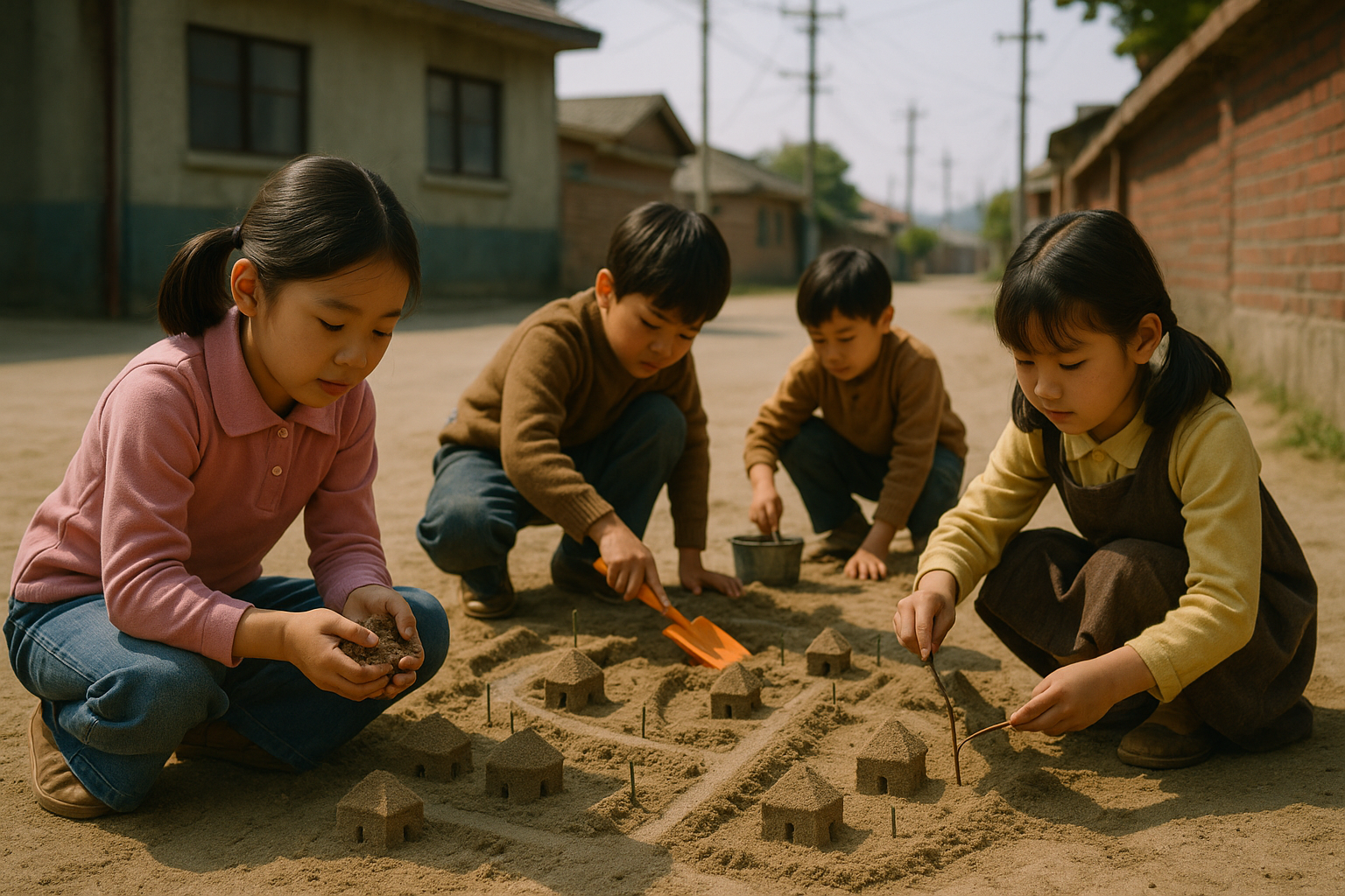 모래나 흙을 이용해 마을을 만들며 노는 놀이입니다. "골목집 짓기"라고도 불리며, 집, 길, 논 등을 손으로 만들며 사회적 역할극이 함께 어우러졌습니다.