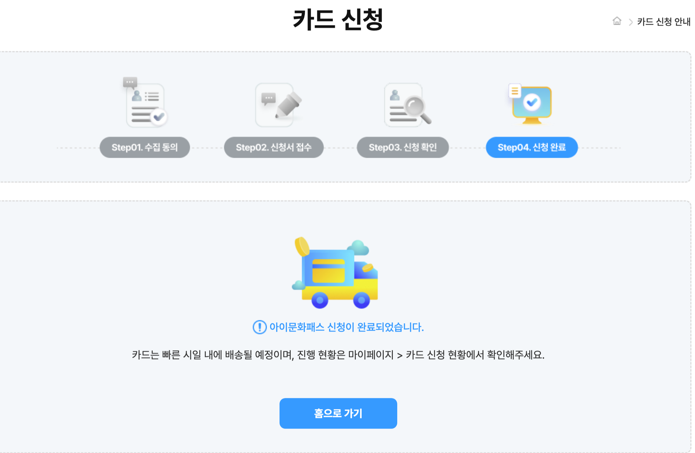 아래와 같이 간단한 인증과 클릭 몇개만 거치면 신청부터 카드 수령까지 완료됩니다.