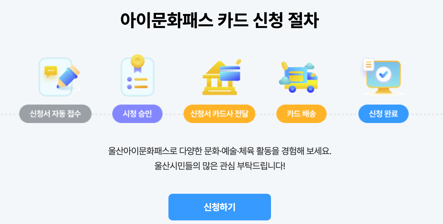 2025년 6월1일 부터 울산에 거주하고있는 초등학생 대상으로 매년 10만원씩 지원하는 울산 아이문화패스 카드를 신청 할 수 있습니다. 울산 아이문화패스는 문화·예술·체육 활동을 부담 없이 누릴 수 있는 특별한 카드로, 다양한 예능, 문화 체험 기회를 제공하고 있습니다.